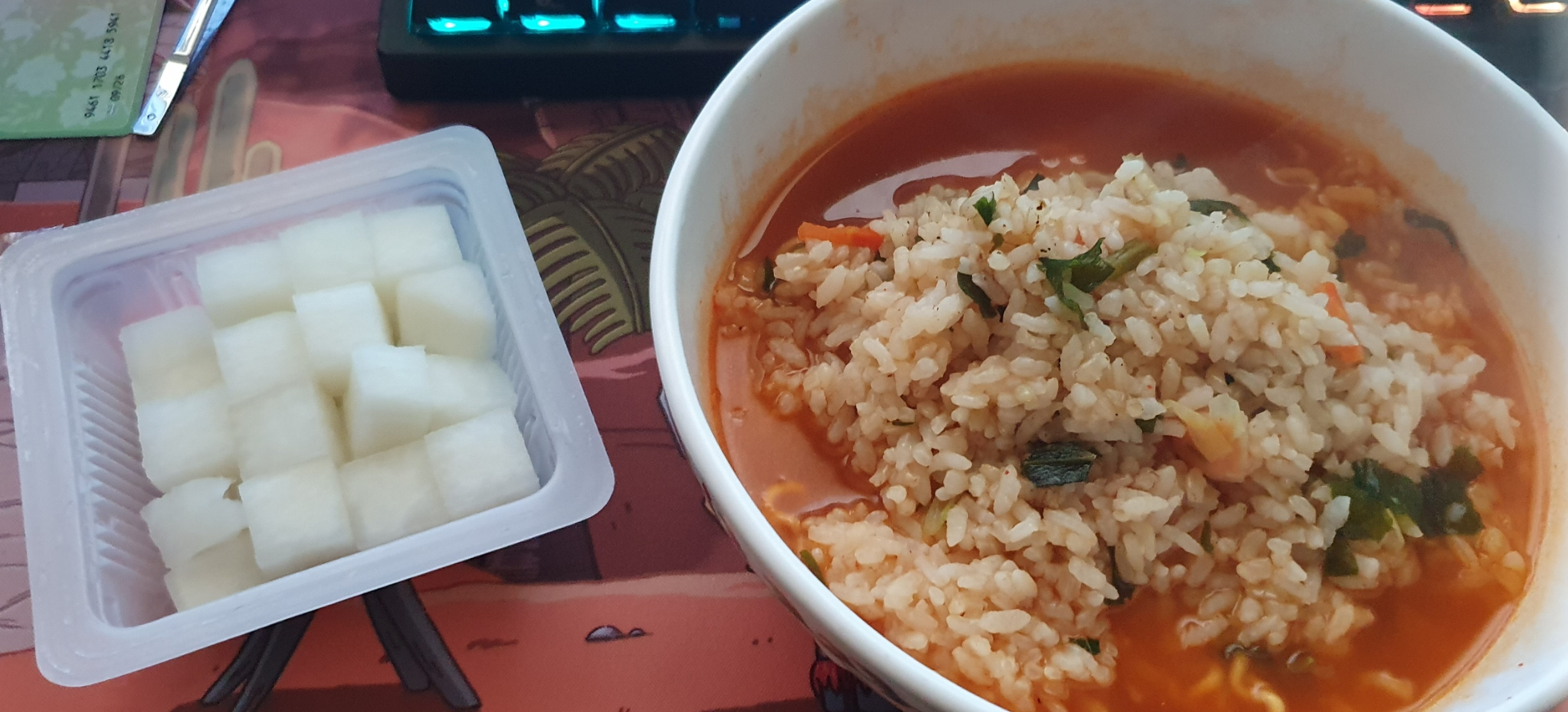 저녁 : 치킨무, 삼양해물라면 + 현미밥.